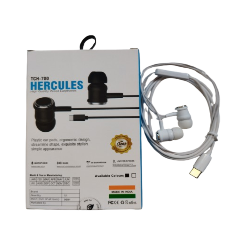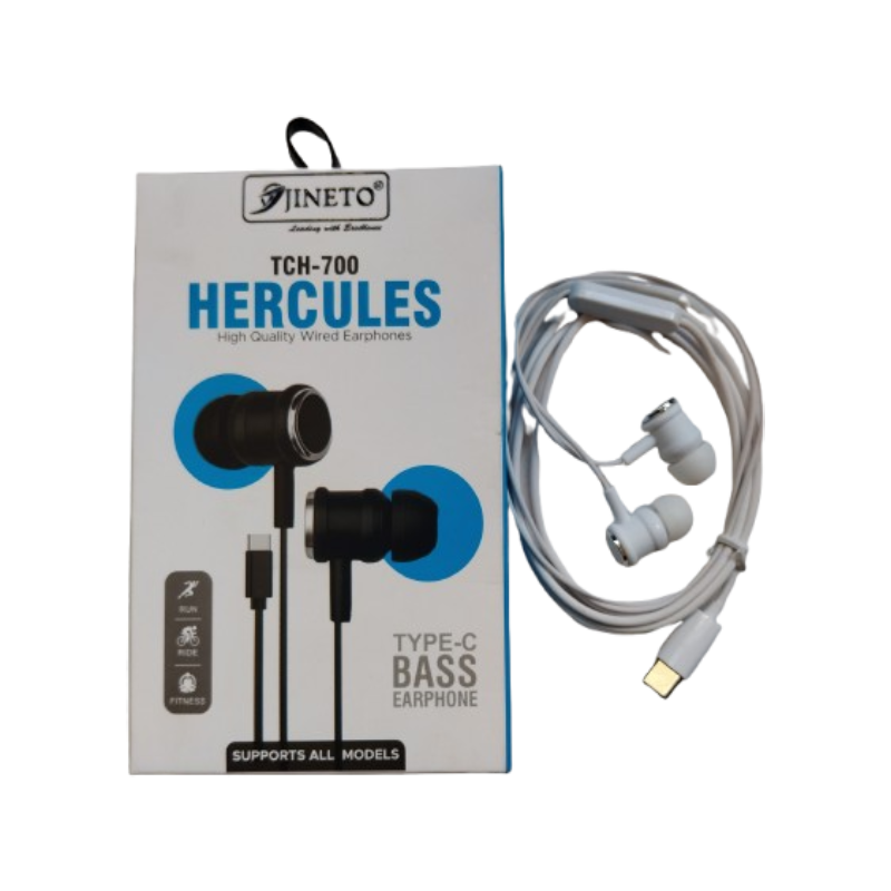 JINETO TCH-700 Hercules earphones are designed for powerful bass and clear sound. With Type-C connectivity, these earphones are perfect for modern smartphones without headphone jack. Comfortable fit and in-built mic make it ideal for music, calls, and daily usage.