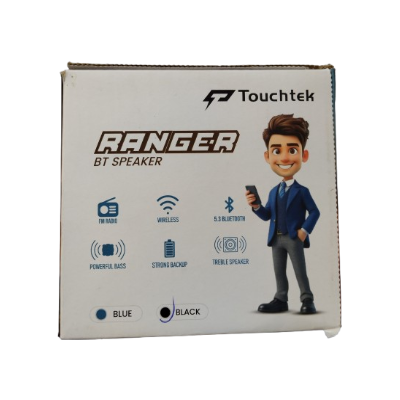 Touchtek Ranger BT Speaker delivers deep bass and clear audio for daily music use. With Bluetooth, FM, USB & TF support, you get multiple ways to play music anytime, anywhere. Perfect for travel, home, and gifting.